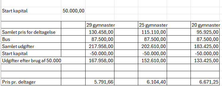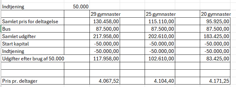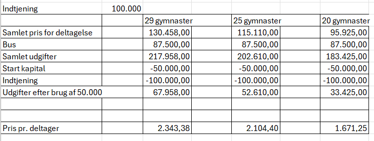Herudover har vi prøvet at give et billede af hvordan økonomien for turen ser ud i 3 forskellige scenarier, idet jo større indtjening naturligvis giver en lavere egen betaling.